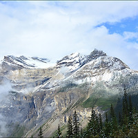 산 위는 구름이 머물고 긴 물줄기인 요호글라이셔폭포는